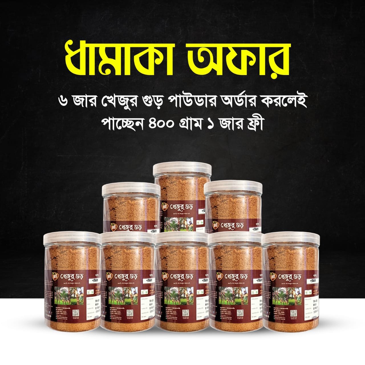 খেজুর গুড় পাউডার ৪০০ গ্রাম করে ৬ জার নিলেই পাবেন ১ জার সম্পুর্ন ফ্রী (মোট ৭ জার)